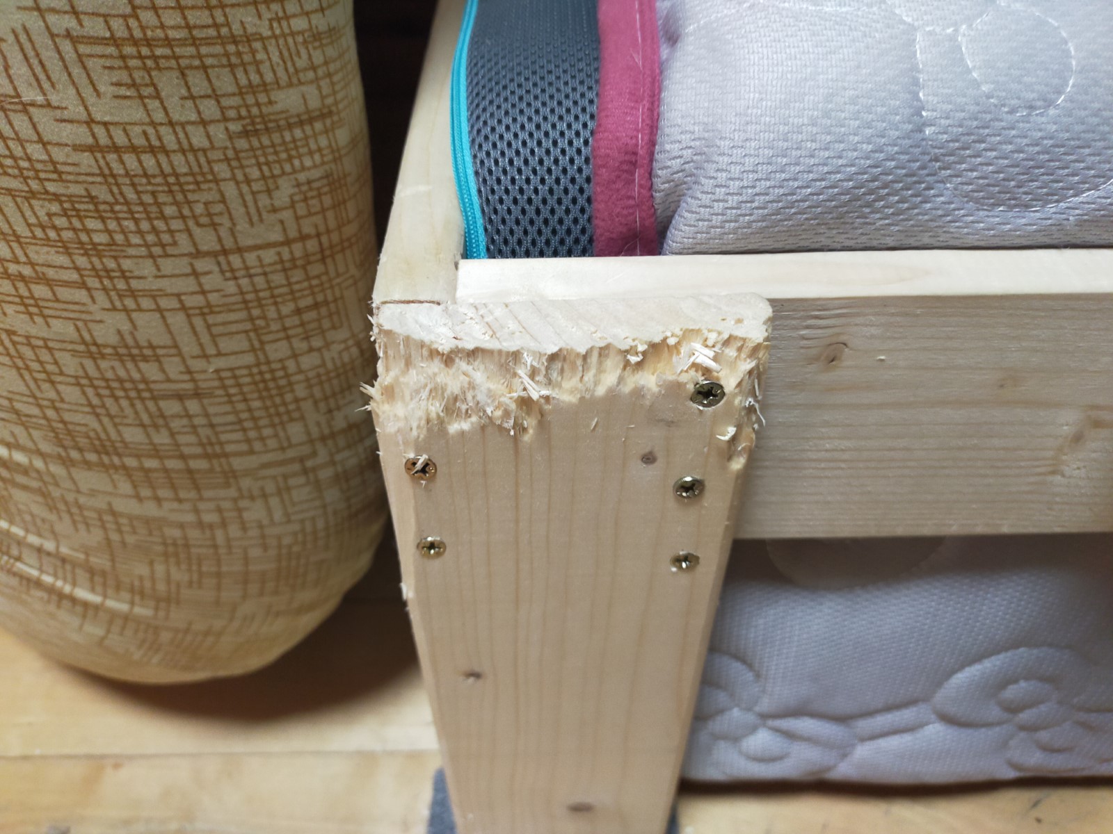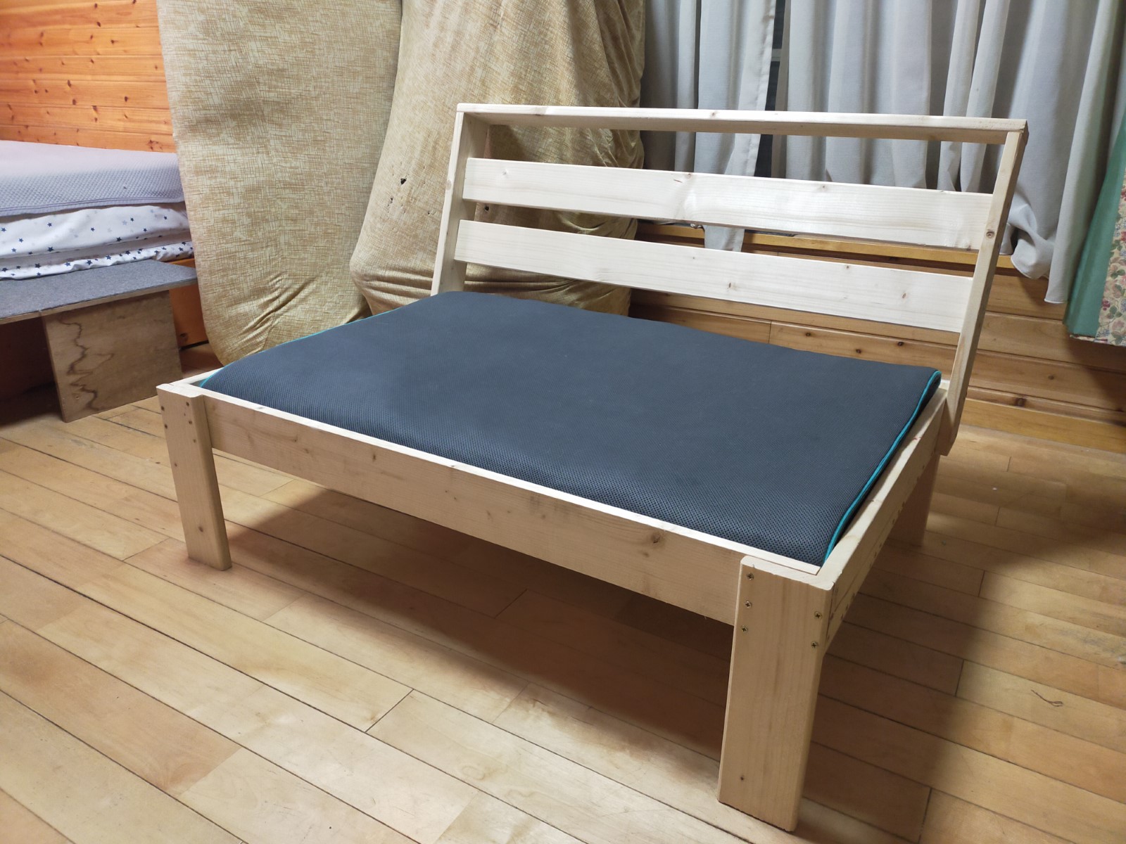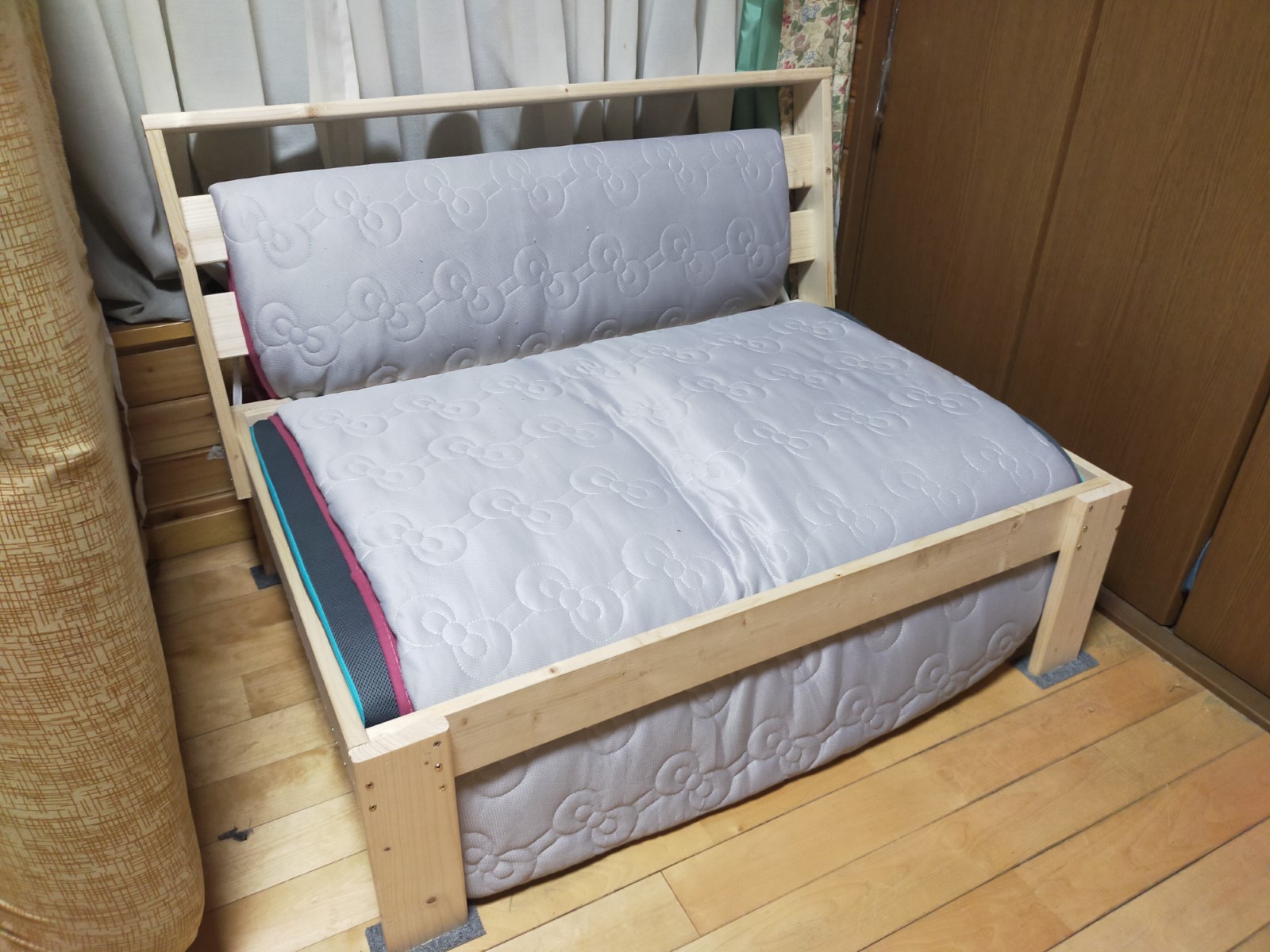 Temuで買ったベッドマットの経たったものを重ねて座面と背面に通して終わりです。