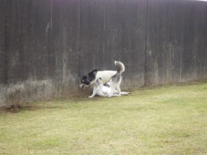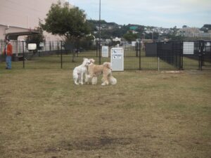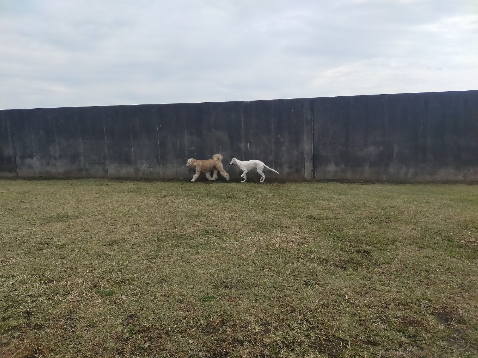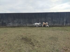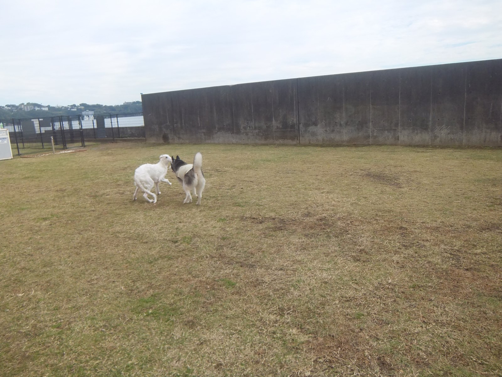 まずはフリースペース(どの犬種もOK)が誰も居ないので、れあくんとシェリィちゃんの2犬で遊ばせます。