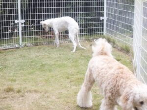 フェンス越しに他の大型犬や小型犬が居たので慣らします。